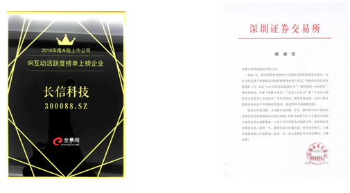 于此同時,公司也獲得深圳證券交易所投資者中心的表彰,并以感謝信的形式表彰企業(yè)在2018年度投資者保護方面、提升投資者知識水平和風險防范意識方面、及作為資本市場主體促進資本市場健康方面的自我擔當所做出的努力和貢獻。