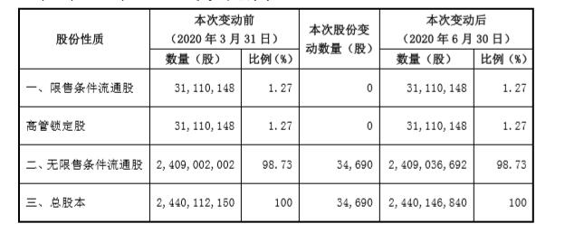 2020年第二季度,長信轉(zhuǎn)債因轉(zhuǎn)股減少2,161張,轉(zhuǎn)股數(shù)量為34,690股。截至2020年6月30日,公司可轉(zhuǎn)債尚有3,470,818張,剩余可轉(zhuǎn)債金額為347,081,800.00元。公司股份變動情況如下: